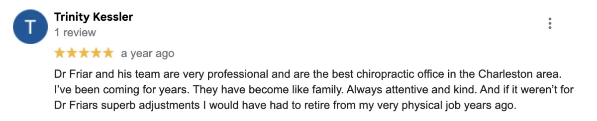 Our office has helped countless people in the Charleston area address assorted health symptoms, aches and pains. The number one priority at our office is ensuring that each and every patient feels like family from the second they walk in. Our staff will work relentlessly alongside you to get to the bottom of any symptoms that you may be experiencing so that we can determine a course of action moving forward to reduce or get rid of the symptoms entirely.